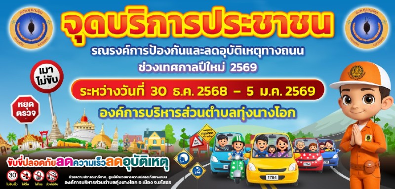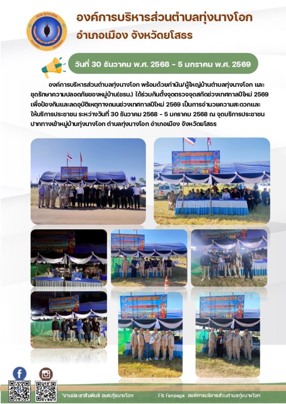 องค์การบริหารส่วนตำบลทุ่งนางโอก พร้อมด้วยกำนัน/ผู้ใหญ่ตำบลทุ่งนางโอก และชุดรักษาความปลอดภัยของหมู่บ้าน(ชรบ.) ได้ร่วมจุดตรวจจุดสกัดช่วงเทศกาลปีใหม่ พ.ศ.2569 เพื่อป้องกันและลดอุบัติเเหตุทางถนนช่วงเทศกาลปีใหม่ พ.ศ.2569 เป็นการอำนวยความสะดวกและให้บริการประชาชน ระหว่างวันที่ 30 ธันวาคม 2568 - 5 มกราคม 2569 ณ จดบริการประชาชนปากทางเข้าหมู่บ้านทุ่งนางโอก ตำบลทุ่งนางโอก อำเภอเมือง จังหวัดยโสธร