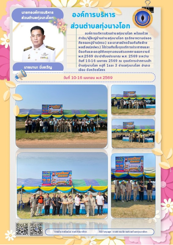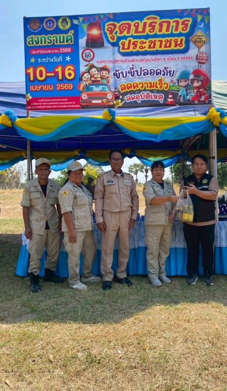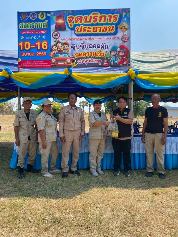 องค์การบริหารส่วนตำบลทุ่งนางโอก นำโดยนายมานะ มิ่งขวัญ นายกองค์การบริหารส่วนตำบล พร้อมด้วยกำนัน/ผู้ใหญ่บ้านตำบลทุ่งนางโอก ชุดรักษาความปลอดภัยของหมู่บ้าน(ชรบ.) และอาสาสมัครป้องกันภัยฝ่ายพลเรือน(อปพร.) ได้ร่วมกันจัดตั้งจุดบริการประชาชน ขับขี่ปลอดภัย ลดความเร็ว ลดอุบัติเหตุ วัตถุประสงค์เพื่อเป็นการป้องกันและลดอุบัติเหตุทางถนนช่วงเทศกาลสงกรานต์ พ.ศ.2569 ประจำปีงบประมาณ 2569 ระหว่างวันที่ 10-16 เมษายน 2569 ณ จุดบริการประชาชนปากทางเข้าบ้านทุ่งนางโอก หมู่ที่ 1 และ 3 ตำบลทุ่งนางโอก อำเภอเมือง จังหวัดยโสธร