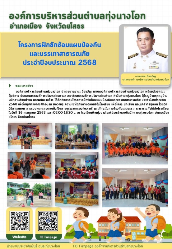 องค์การบริหารส่วนตำบลทุ่งนางโอก นำโดยนายมานะ มิ่งขวัญ นายกองค์การบริหารส่วนตำบลทุ่งนางโอก พร้อมด้วยคณะผู้บริหาร ประธานสภาองค์การบริหารส่วนตำบล สมาชิกสภาองค์การบริหารส่วนตำบล กำนันตำบลทุ่งนางโอก ผู้ใหญ่บ้านทุกหมู่บ้าน พนักงานส่วนตำบล และพนักงานจ้าง ได้จัดกิจกรรมโครงการฝึกซักซ้อมแผนป้องกันและบรรเทาสาธารณภัย ประจำปีงบประมาณ 2568 เพื่อให้ผู้เข้ารับการฝึกอบรม มีความรู้ ความเข้าใจภัยด้านอัคคีภัยในโรงเรียน เพื่อให้ครู นักเรียน และบุคลากรทุกคน ได้รู้จักวิธีการอพยพ การรวมพล ตลอดจนทั้งเป็นการบูรณาการองค์ความรู้ และทักษะในการป้องกันและบรรเทาสาธารณภัยให้กับโรงเรียน ในวันที่ 16 กรกฎาคม 2568 เวลา 08.00-16.30 น. ณ โรงเรียนบ้านทุ่งนางโอก(อ่อนอำนวยศิลป์) ตำบลทุ่งนางโอก อำเภอเมืองยโสธร จังหวัดยโสธร
